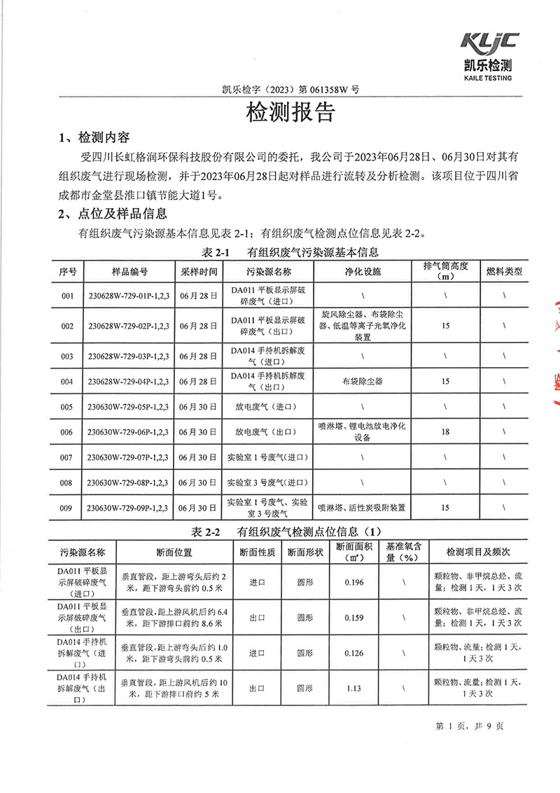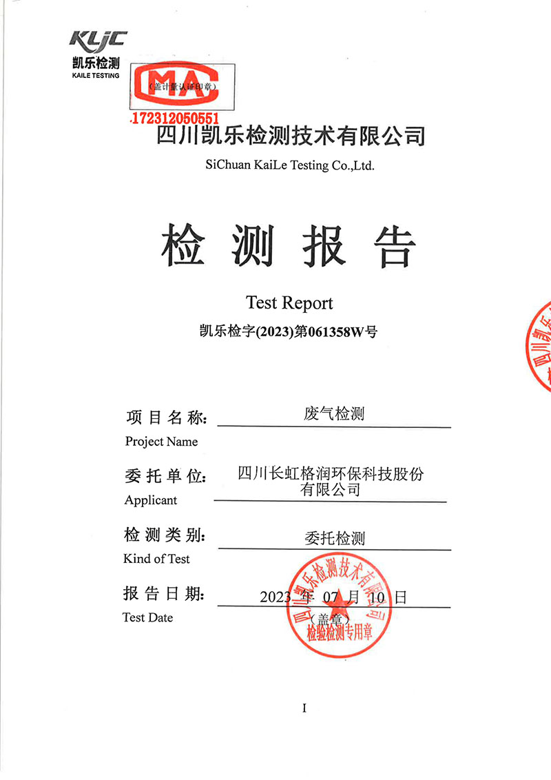 2023第061358W號四川長虹格潤環(huán)??萍脊煞萦邢薰荆◤U氣檢測)報告