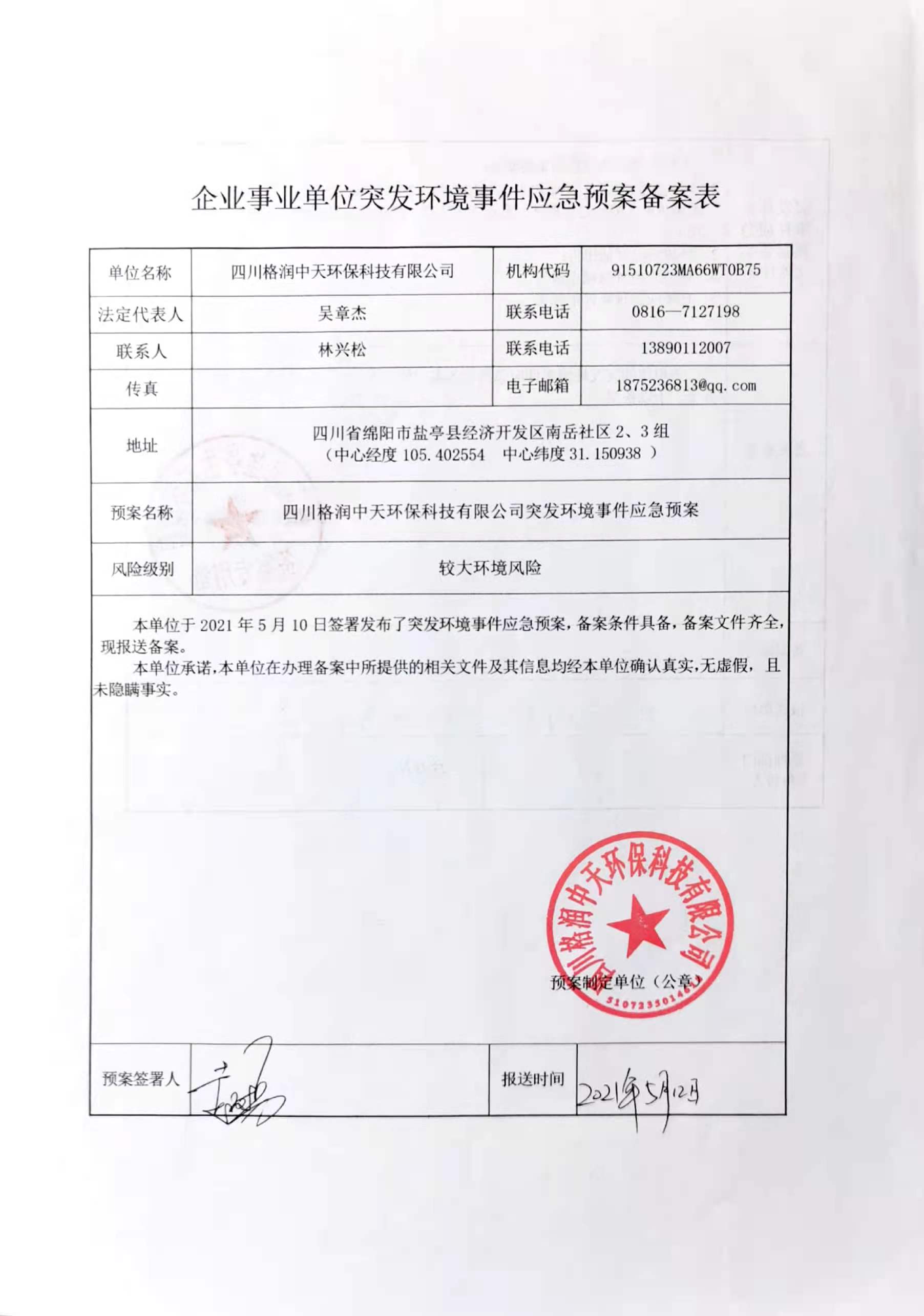 四川格潤中天環(huán)??萍加邢薰緫?yīng)急預(yù)案備案表